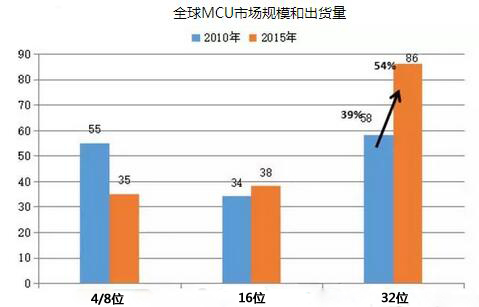 IC Insights研究報告顯示,2015年全球MCU市場規(guī)模達到168億美元,較去年增長5.6%,出貨量255億顆比去年提升12.4%,預(yù)計2016年全球MCU市場出貨量將突破300億顆大關(guān)。其中,2015年全球32位MCU出貨量超過4/8位MCU與16位MCU出貨量的總和,而且未來幾年應(yīng)該會保持30%左右的高速增長的水平。